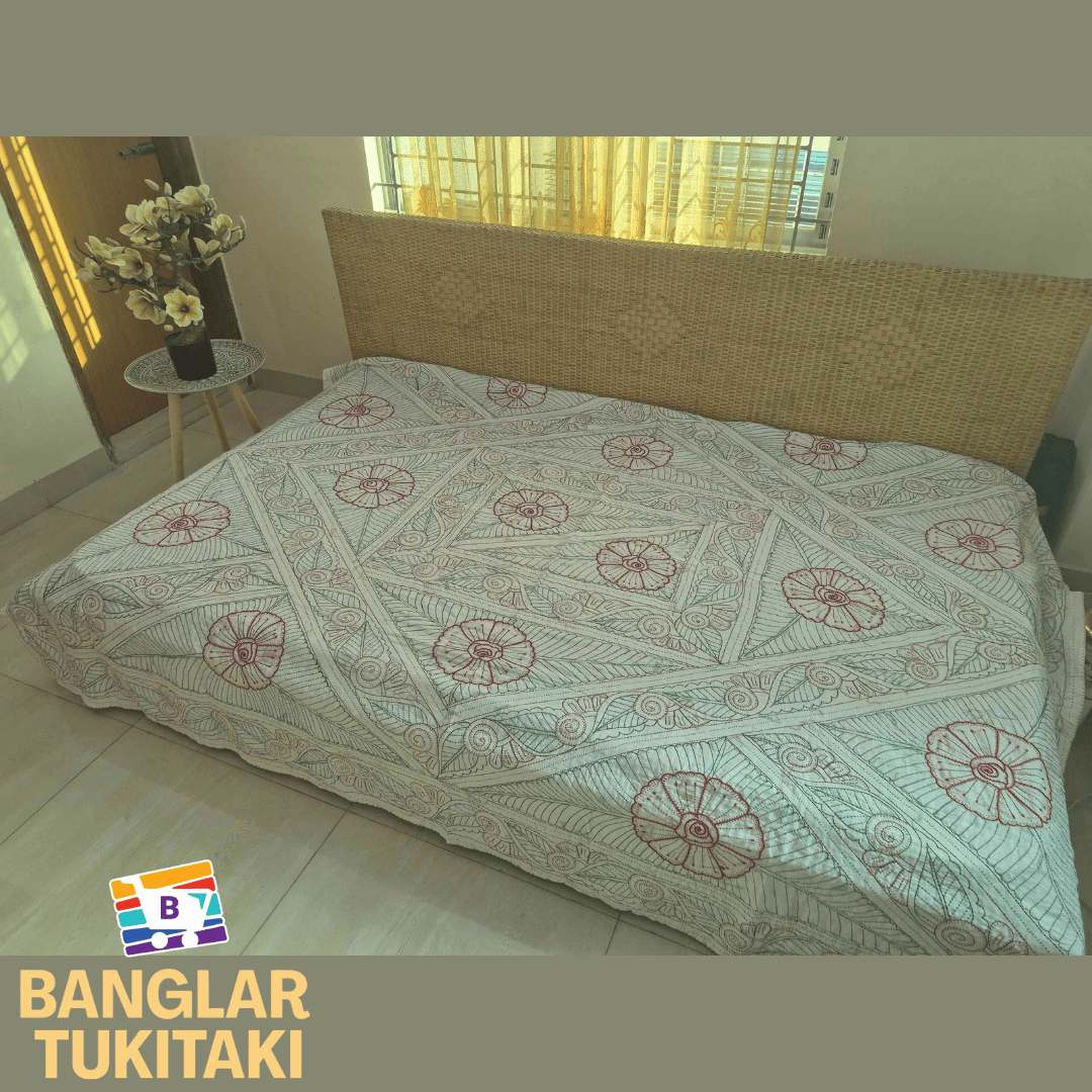 A handcrafted White Nakshi Kantha made in Jamalpur using traditional embroidery techniques. Ideal for use as a bedspread, throw, or decor piece.